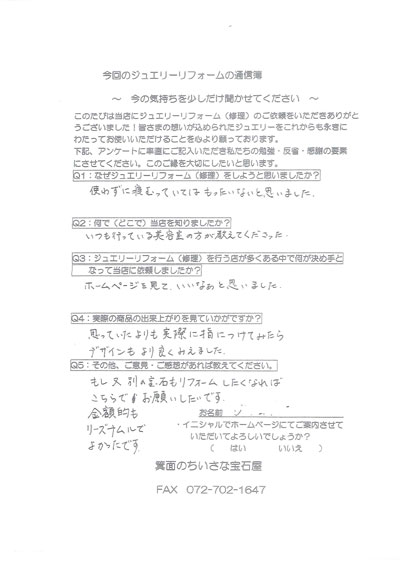 もし又、別の宝石もリフォームしたくなれば、こちらでお願いしたいです。金額的にもリーズナブルでよかったです。