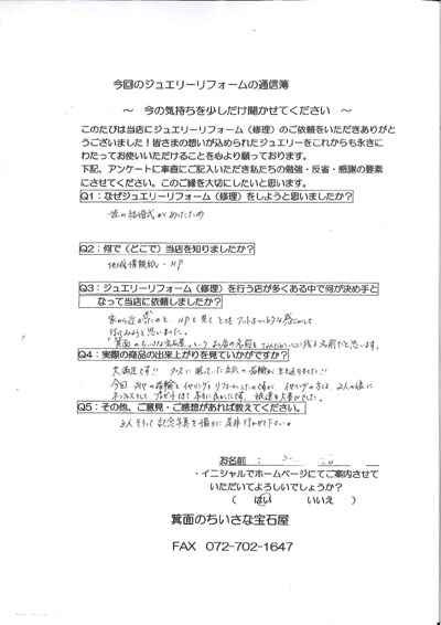 大満足です!!タンスに眠っていた立爪の指輪が生まれ変わりました。今回ダイヤの指輪とイヤリングをリフォームしたのですが、イヤリングの方は2人の娘にネックレスとしてプレゼントできて本当に良かったです。