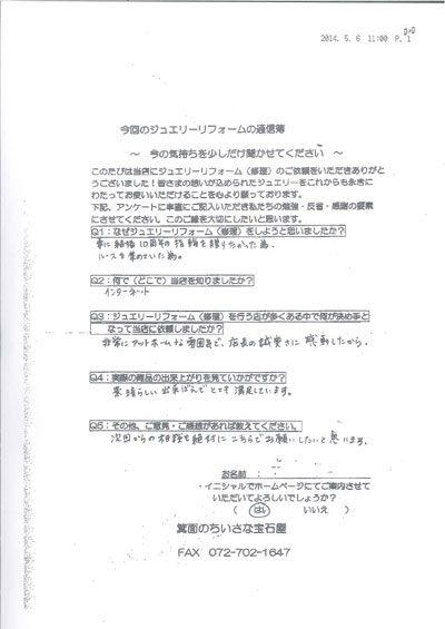 インターネットで。ジュエリーリフォームを行う店が多くある中で何が決め手となって当店に依頼をしましたか?