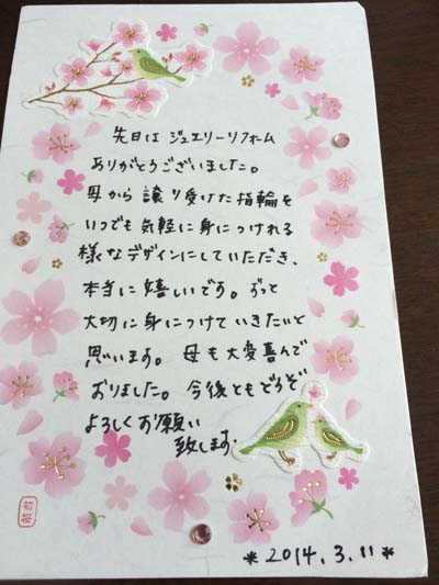 母も大変喜んでおりました。今後ともどうぞよろしく御願いいたします」