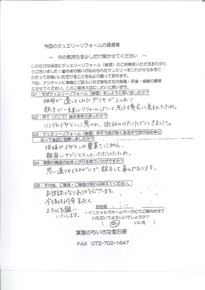 祖母が遺してくれたダイヤが2つあり、親子で一緒にリフォームしたいと思う機会に恵まれたため。何で(どこで)当店を知りましたか?(検索ワードは?)