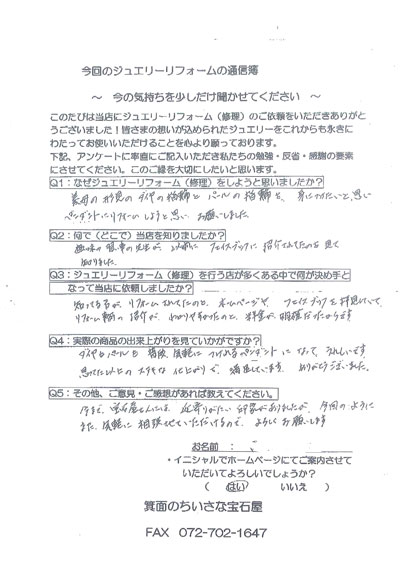 今まで宝石屋さんには近寄りがたい印象がありましたが、今回のように気軽に相談させていただけるので、またよろしくお願いします。店長より