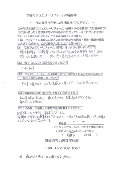 A 娘の結婚を生前楽しいに待っていてくださった方の指輪なので、今回リフォームをお願いして一緒に式を見せてあげたいとお願いしました。何で(どこで)当店を知りましたか?(検索ワードは?)