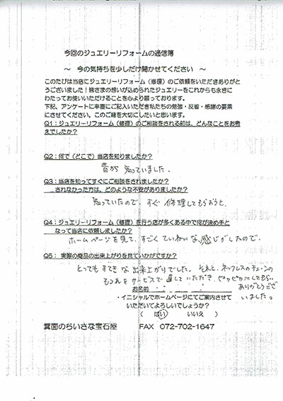 とてもすてきな出来上がりでした。それとネックレスのチェーンのもつれをサービスで直していただきピカピカにしてもらいありがとうございました。