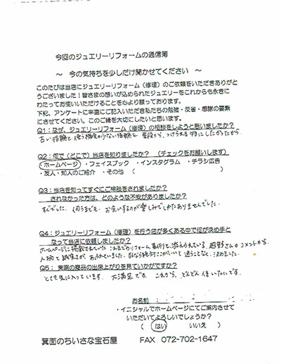 古い指輪と使う機会の少ない指輪を普段からつけれらるものにしたかったから。何で(どこで)当店を知りましたか?(検索ワードは?)