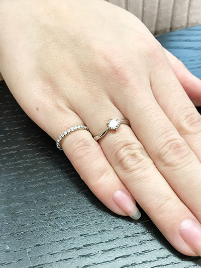 このたびはありがとうございました!!悩まれた末にお選びいただいたこちらのデザイン。きっと長く重宝して使っていただけると思います。フルエタニティーのピンキーリングとのコーディネートも素敵ですね!