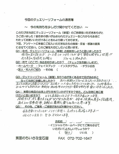 とても素敵に仕上げていただき喜んでいます。結婚リングすら着けることがなくなりましたが、まずは息子の結婚式、友人との食事会等、気軽に着用し楽しみたいと思います。その他、ご意見・ご感想があればお聞かせください