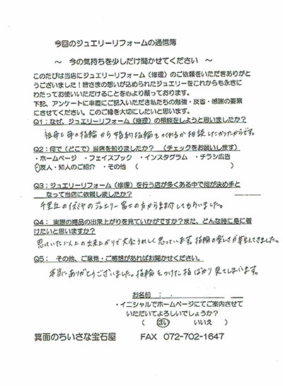祖母と母の指輪から婚約指輪をつくれるか相談したかったからです。何で(どこで)当店を知りましたか?(検索ワードは?)