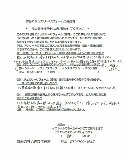 成人した記念にと母から贈られたハート型のネックレスでしたが、30歳をこえてデザイン的に着用しにくくなっていたので、せっかくの母からの贈り物を身に着ける方法はないかと思いお願いしました。何で(どこで)当店を知りましたか?(検索ワードは?)