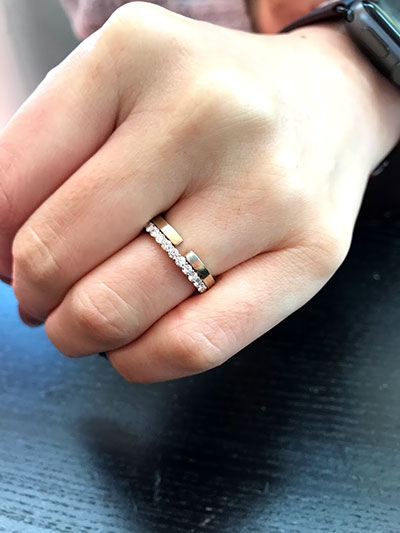 これまでのリフォームの内容をHPで公開されていて、自分のもこんな風に変身したらいいなと思ってお店を訪問しました。元の指輪はピンクの石とその周りをダイヤが囲んだものだったのですが、思ったよりもダイヤが多く、密かに憧れていたエタニティデザインの指輪を作っていただけることになりました。ピンクの石はしばらく保管して、またお金をためて指輪にしたいと思います。実際の商品の出来上がりを見ていかがですか?また、どんな時に身に着けたいと思いますか?