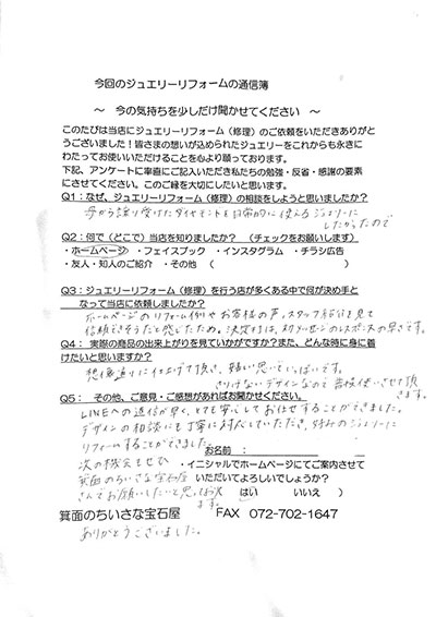 LINEへの返信が早くとても安心してお任せすることができました。デザインの相談にも丁寧に対応していただき、好みのジュエリーにリフォームすることができました。次の機会もぜひ箕面のちいさな宝石屋さんでお願いしようと思っております。ありがとうございました!