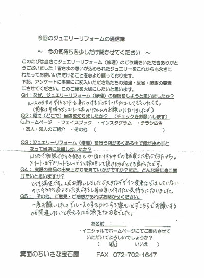 ルースのままのダイヤモンドを身につけるジュエリーに加工してもらいたくて(実際は手持ちジュエリー2点のリフォームのお願いになりましたが)何で(どこで)当店を知りましたか?(検索ワードは?)