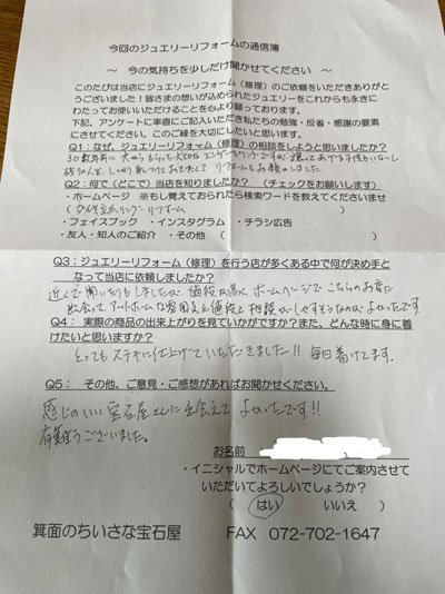 30数年前に夫からもらった大切なエンゲージリングですが、譲ってあげる子供もいないし、残りの人生しっかりと身に着けておきたくてリフォームをお願いしました。何で(どこで)当店を知りましたか?(検索ワードは?)