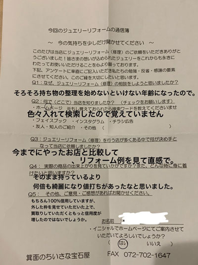 ホームページ(色々入れて検索したので覚えていません・・)ジュエリーリフォームを行う店が多くある中で何が決め手となって当店に依頼をしましたか?