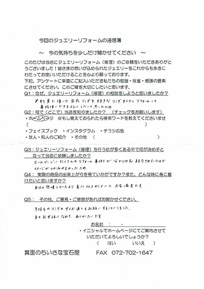 形見で頂いた立て爪リングを好きなリングタイプにリフォームして普段使いできるようにしたいと思ったため何で(どこで)当店を知りましたか?(検索ワードは?)