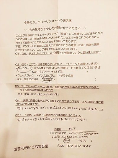 ホームページ(Googleでジュエリーリフォームで検索)ジュエリーリフォームを行う店が多くある中で何が決め手となって当店に依頼をしましたか?