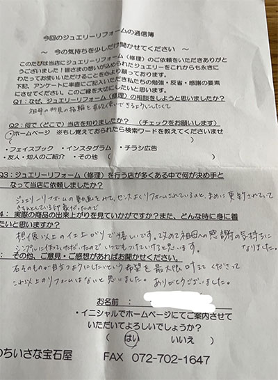 祖母の形見の指輪を普段使いできるようにしたくて何で(どこで)当店を知りましたか?(検索ワードは?)
