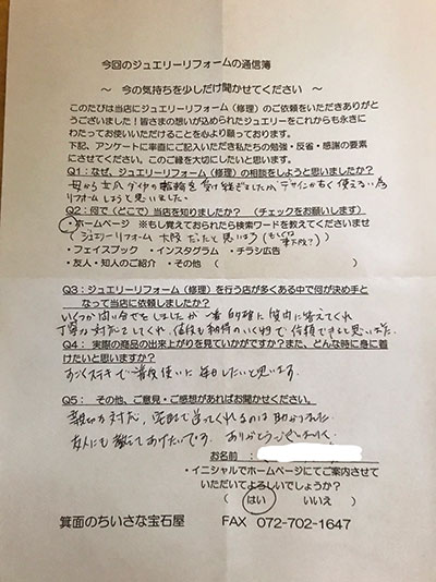 ホームページ(ジュエリーリフォーム大阪だったと思う。もしくは東大阪?)ジュエリーリフォームを行う店が多くある中で何が決め手となって当店に依頼をしましたか?