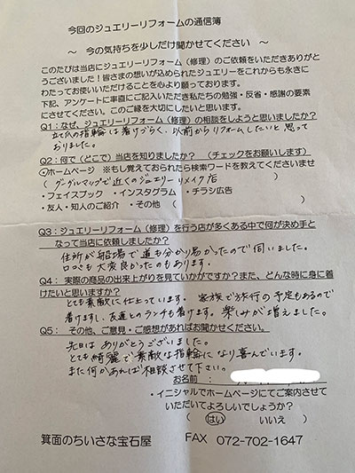 立て爪の指輪は使いづらく、以前からリフォームしたいと思ってました。何で(どこで)当店を知りましたか?(検索ワードは?)