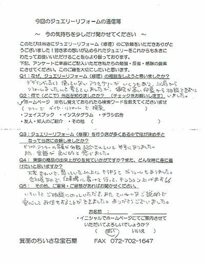 デザインが古くて使っていないアクセサリーがいくつもあり、以前からリフォームをしたいと考えていましたが、値段が高い印象から相談できずにいました。何で(どこで)当店を知りましたか?(検索ワードは?)