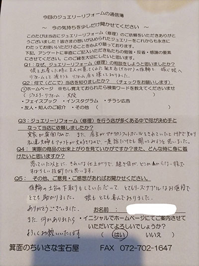 ホームページ (ジュエリーリフォーム 大阪)ジュエリーリフォームを行う店が多くある中で何が決め手となって当店に依頼をしましたか?