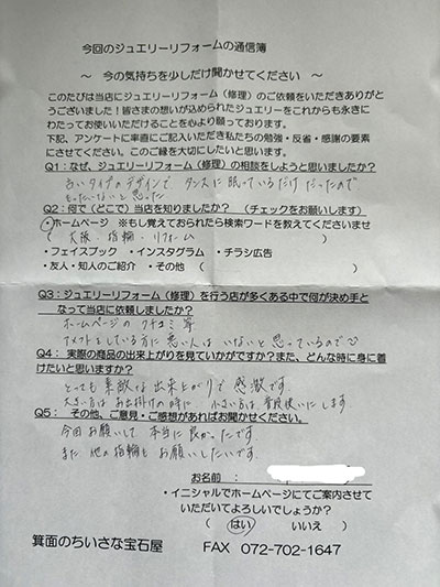 ホームページ(大阪・指輪・リフォーム)ジュエリーリフォームを行う店が多くある中で何が決め手となって当店に依頼をしましたか?