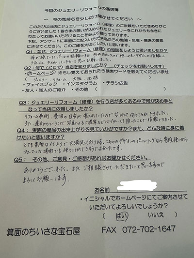 ホームページ (ジュエリーリフォーム 大阪 北摂)ジュエリーリフォームを行う店が多くある中で何が決め手となって当店に依頼をしましたか?