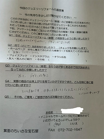 ホームページ (箕面 ジュエリーリメイク)ジュエリーリフォームを行う店が多くある中で何が決め手となって当店に依頼をしましたか?