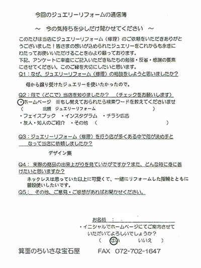 ホームページ (北摂 ジュエリーリフォーム)ジュエリーリフォームを行う店が多くある中で何が決め手となって当店に依頼をしましたか?