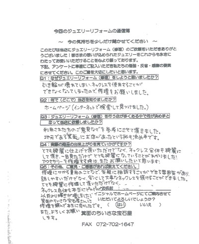 引き輪が壊れてしまい、ネックレスを使用することができなくなってしまったので修理をお願いしました。何で(どこで)当店を知りましたか?(検索ワードは?)