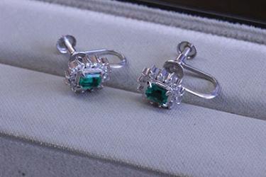 エメラルドのイヤリングは昔、流行した取り巻きタイプのデザイン。