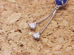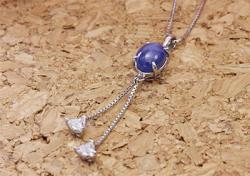 メインのスターサファイアの石はシンプルに。そしてベネチアンチェーンを2本垂らしてその先にトリリアントダイヤをぶら下げるデザインをご提案させていただきました。