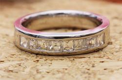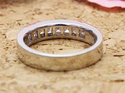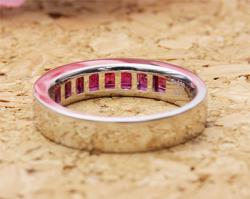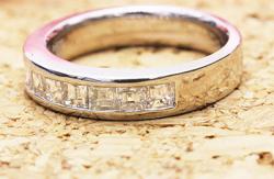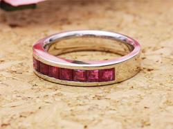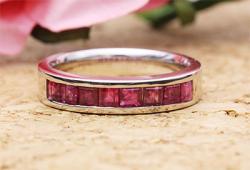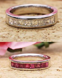 角型のダイヤモンドとルビー。なかなかリフォームできる選択肢が少ない中で、レール留めのデザインのご提案をさせていただきました。