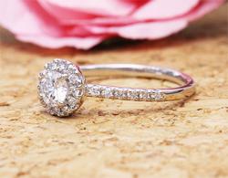 お選びいただいたのは当店での人気モデルでもある取り巻きタイプのデザイン。ダイヤの周囲は豪華に、そして腕の部分は華奢なイメージとアクセントの効いたデザインになります。