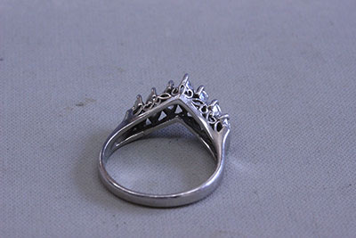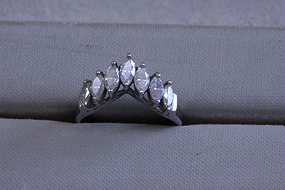お持ちになったジュエリーはマーキースカットのダイヤモンドを使ってV字タイプの昔ならではの指輪
