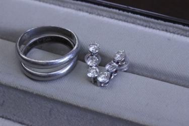 昨年にご主人を亡くされたそうで、ご主人との想い出の結婚指輪、そしてお持ちのスリーストーンダイヤモンドのピアスを使って新しいデザインにリフォームができたらとご相談をいただきました。