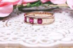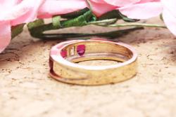 ルビーとルビーの間に角ダイヤを入れて、横に一列に並べたデザインになります。石自体は爪で留めてますが、上下にレールを敷くことによって、引っ掛かりの少ないデザインに仕上がりました。