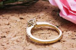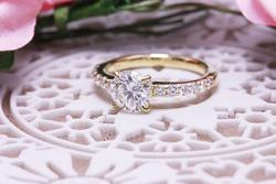 1カラットのダイヤの両サイドに綺麗なメレダイヤを配置した定番の人気デザインになります。