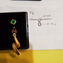 それぞれの石が留まってるパーツをそのまま活かして、エメラルドの指輪にガーネットをチャーム使いでぶら下げる指輪を作らせていただきました。