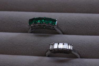 「一文字タイプ」と呼ばれるデザインのダイヤモンドとエメラルドの指輪。