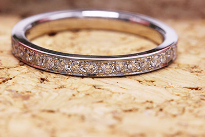 元々は小指のサイズで作らせていただきましたが、今回は薬指のサイズでお作りさせていただいたので、全周にダイヤをあしらったフルエタニティーはなく、一部地金部分を残したエタニティーリングになりました。