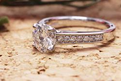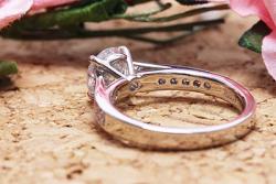 1カラットの立派なダイヤモンドにふさわしい両サイドにメレダイヤが彫留めされた人気のデザインをお選びいただきました。