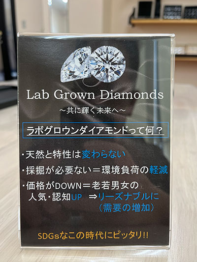 当店でもラボグロウンダイヤの取り扱いはございますので、ご興味のある方はご相談くださいませ。