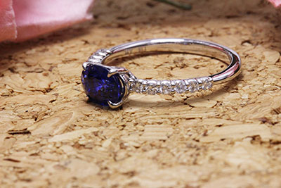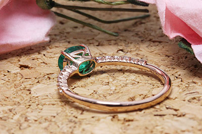 エメラルドはピンクゴールド素材で、サファイアはプラチナ素材で、お揃いの指輪をお作りさせていただきました。