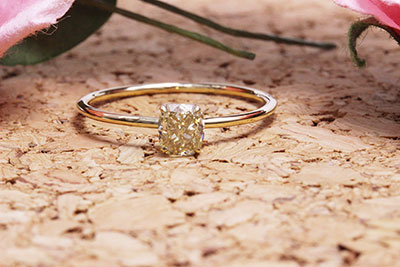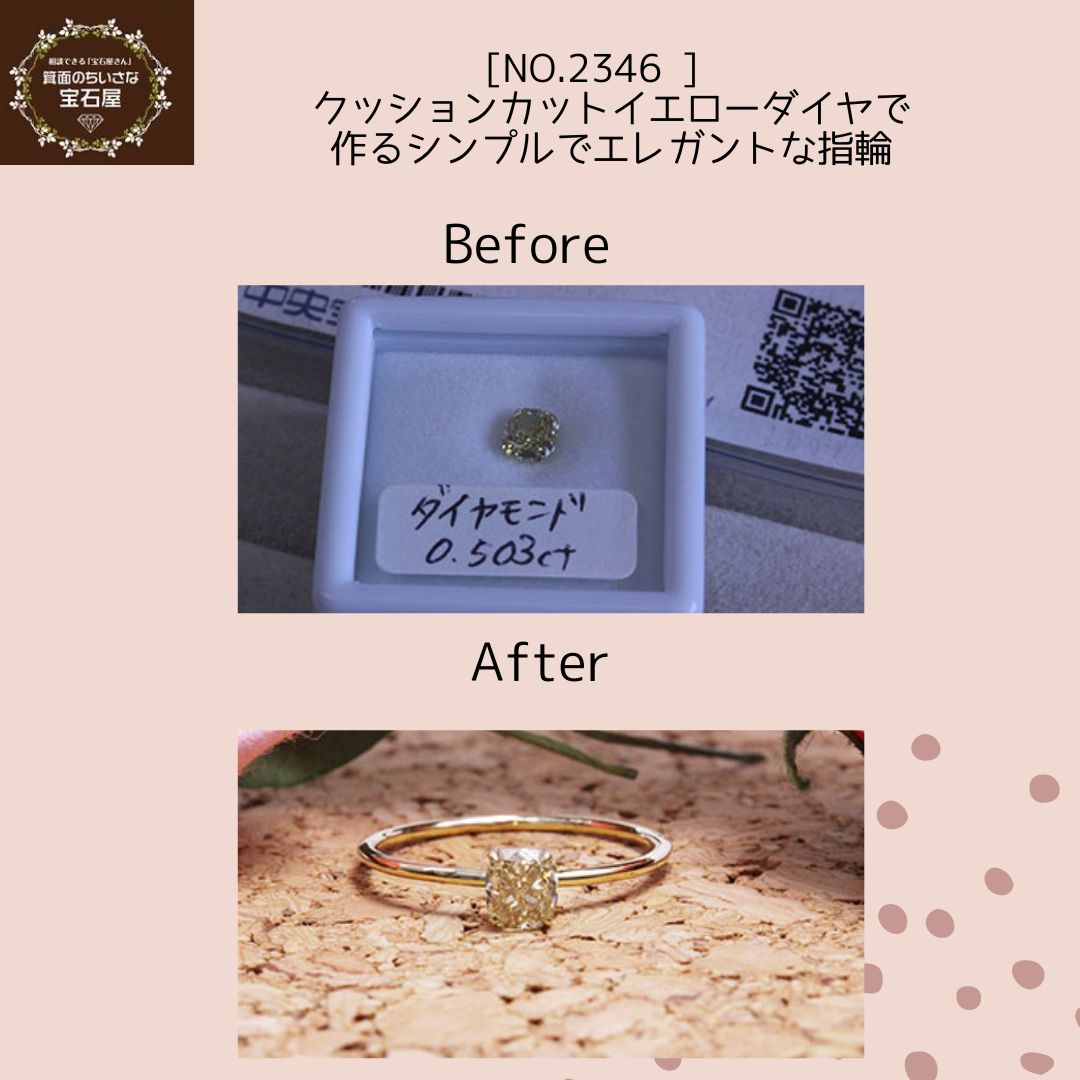 前回はクッションカットのダイヤをイエローゴールドのシンプルなリングを作らせていただきました。