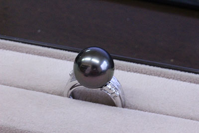 ご夫婦で旅行に行かれた際に旅先でお求めになったタヒチ産の黒蝶真珠の指輪。