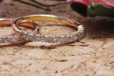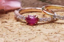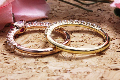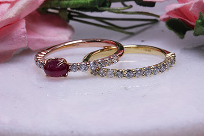 素材については、お客様のご希望でルビーの指輪はピンクゴールドで、ダイヤのハーフエタニティーはイエローゴールドで制作をさせていただきました。