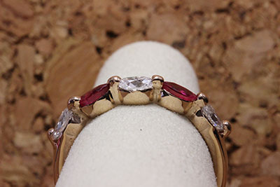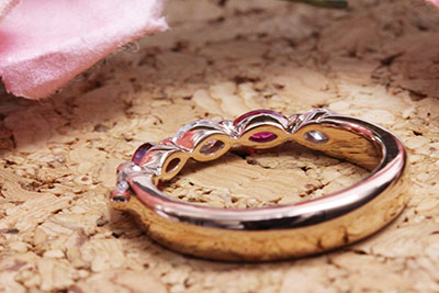 ダイヤ3pc+ルビー2pc、もしくはダイヤ3pc+ルビー4pcという選択肢がありますが、指輪の幅などを考えて、前者のトータル5pcの指輪をお作りさせていただくことになりました。