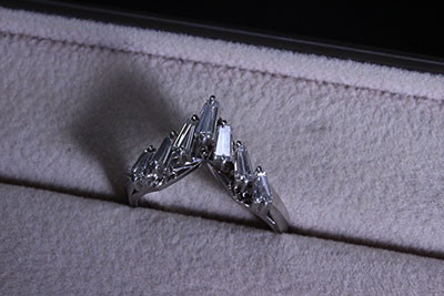 テーパーと呼ばれるカットのダイヤがV字状に並んでいる昔ならではのデザインの指輪でした。