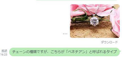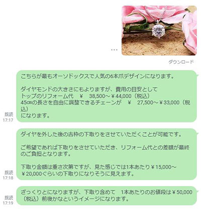 「普通」のデザインがご希望でしたので、まずはスタンダードな6本爪のダイヤのネックレスの画像と費用の目安をLINEでお伝えさせていただきました。